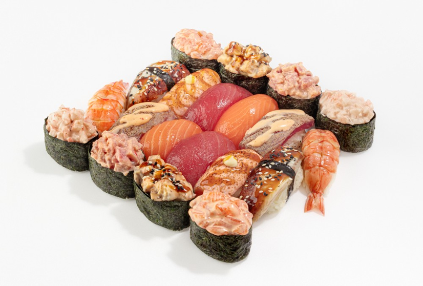 20 ნაჭერი. გუნკანი გველთევზა. გუნკანი ორაგული. გუნკანი კრევეტი. გუნკანი თინუსი. ნიგირი თინუსი გრილი. ნიგირი თინუსი. ნიგირი ორაგული გრილი. ნიგირი ორაგული. ნიგირი კრევეტი .ნიგირი გველთევზა