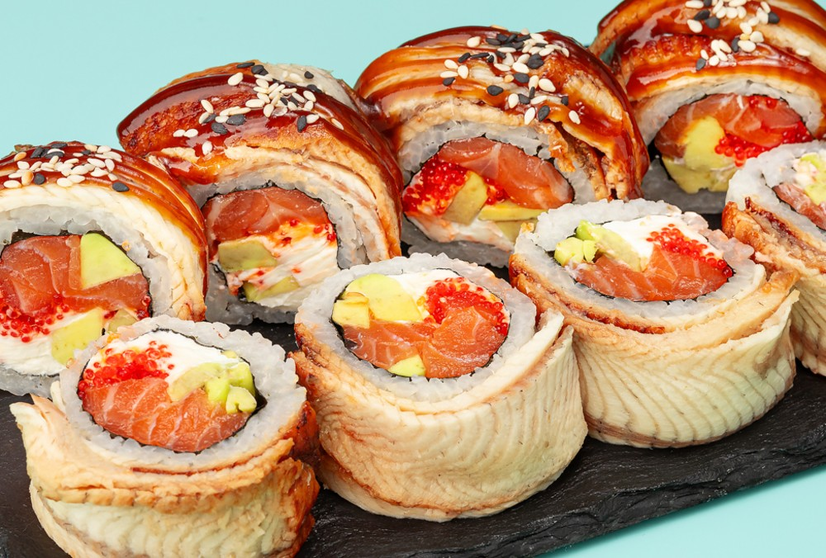 ნორი, ბრინჯი, გველთევზა, ორაგული, ყველი ფილადელფია, ავოკადო, ხიზილალა ტობიკო, უნაგის სოუსი, სეზამის მარცვლები