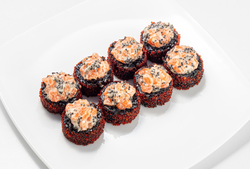8 ც. ნორი, შავი ბრინჯი, თინუსი, ორაგული, ყველი ფილადელფია, კიტრი, ხიზილალა ტობიკო, იაპონური მაიონეზი