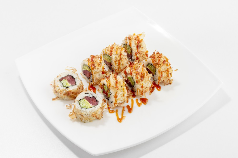ნორი, ბრინჯი, თინუსი, კიტრი, ავოკადო, იაპონური მაიონეზი, თინუსის ფანტელები, უნაგის სოუსი