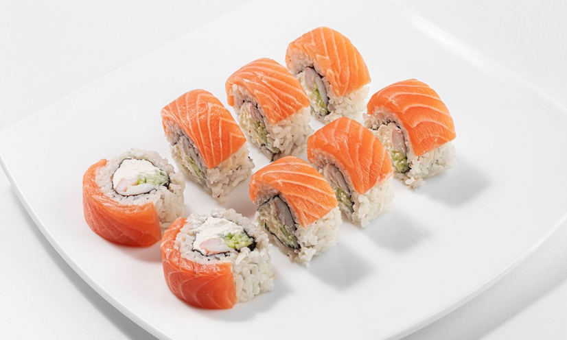 ნორი, მომზადებული ბრინჯი, ფილადელფია ყველი, ახალი კიტრი, ახალი ორაგული, კრევეტი