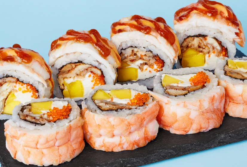 უნაგი სოუსი, ნორი, მომზადებული ბრინჯი, ფილადელფია ყველი, წითელი ტობიკო, მანგო, კრევეტი, ახალი ორაგული