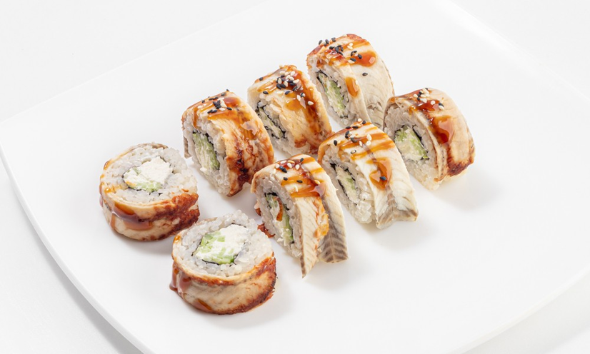 ბრინჯი, კრემ ყველი, კიტრი, უნაგი, სპაისი სოუსი, სეზამი